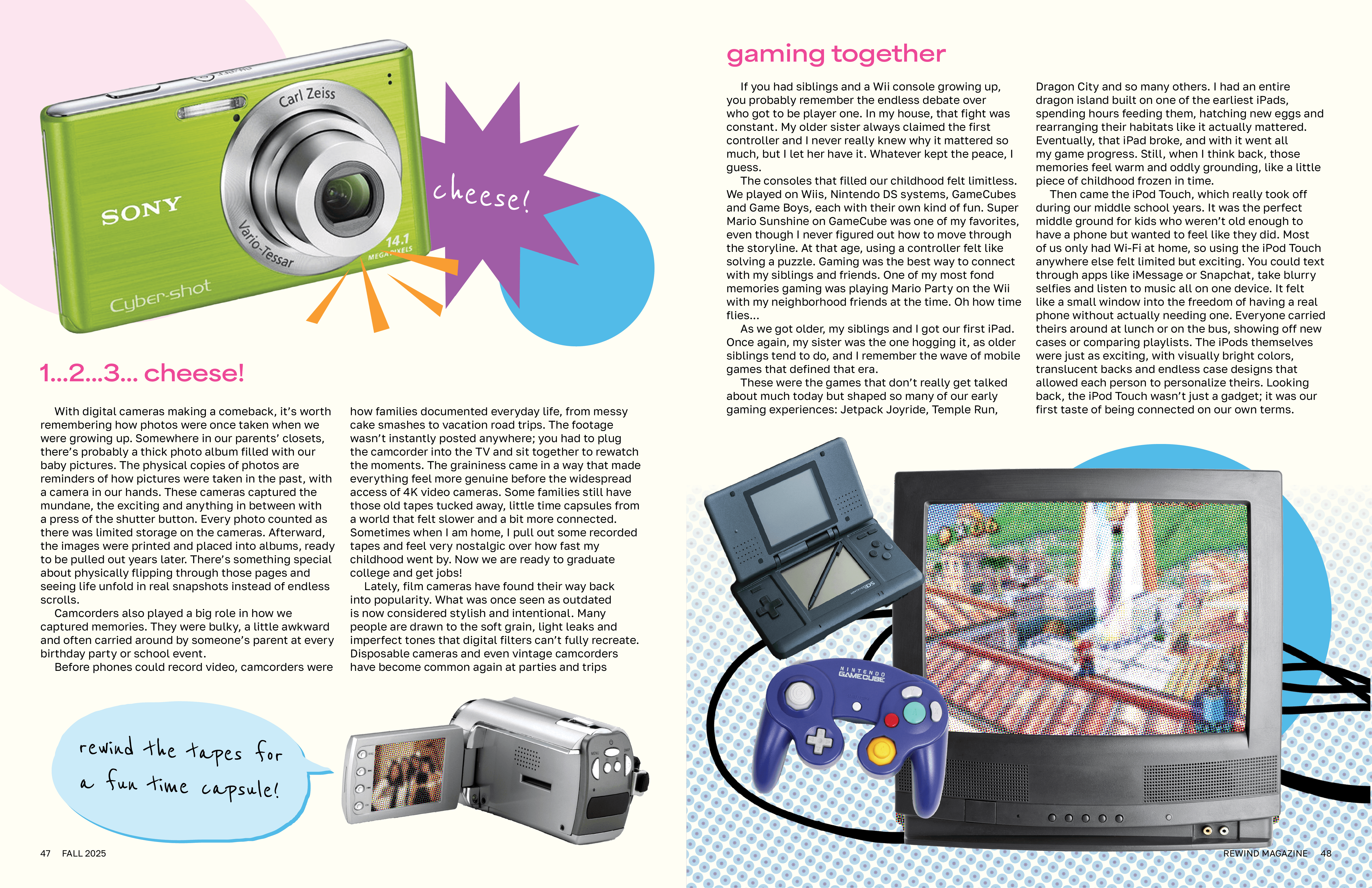 Camcorders also played a big role in how we captured memories. They were bulky, a little awkward and often carried around by someone’s parent at every birthday party or school event. Before phones could record video, camcorders were how families documented everyday life, from messy cake smashes to vacation road trips. The footage wasn’t instantly posted anywhere; you had to plug the camcorder into the TV and sit together to rewatch the moments. The graininess came in a way that made everything feel more genuine before the widespread access of 4K video cameras. Some families still have those old tapes tucked away, little time capsules from a world that felt slower and a bit more connected. Sometimes when I am home, I pull out some recorded tapes and feel very nostalgic over how fast my childhood went by.
